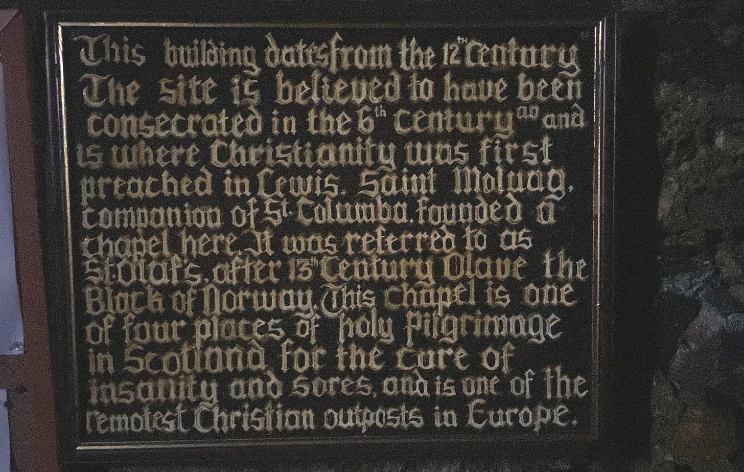 ‘S i an aon eaglais a tha air fhàgail le mullach, bho ro àm an Ath-Leasachaidh ann an Leòdhas. Bho dheireadh thall bhathas ga cleachdadh mar fasgadh airson caoraich gus an do thog iad airgead ann an 1912 airson a dhèanamh an àirde.